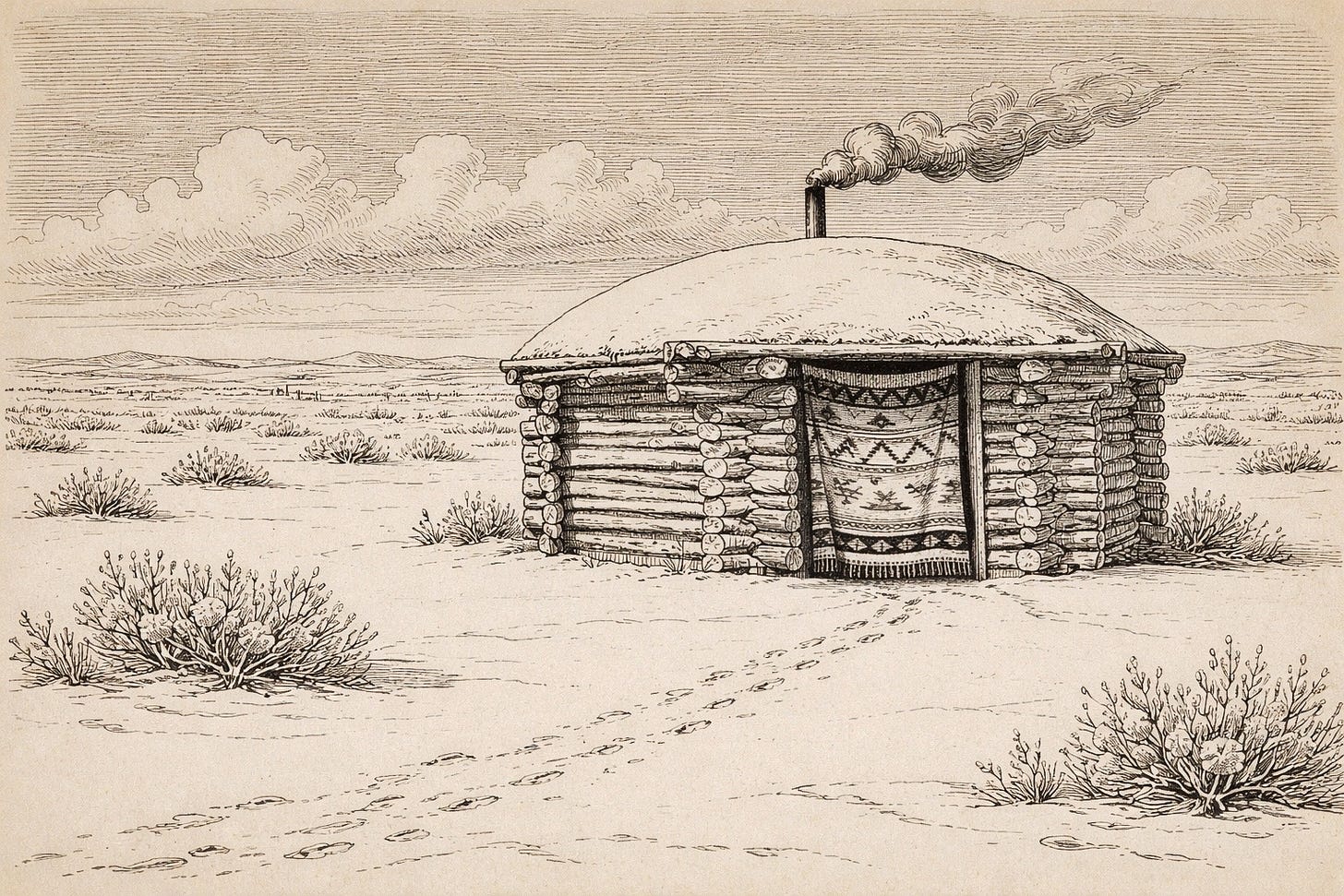 I don’t know for how long we walked behind him before we saw the small building ahead. As we came closer, I saw a plume of smoke rising from the centre of the structure. It looked like a log cabin, though octagonal in shape, with a dirt-covered roof.
